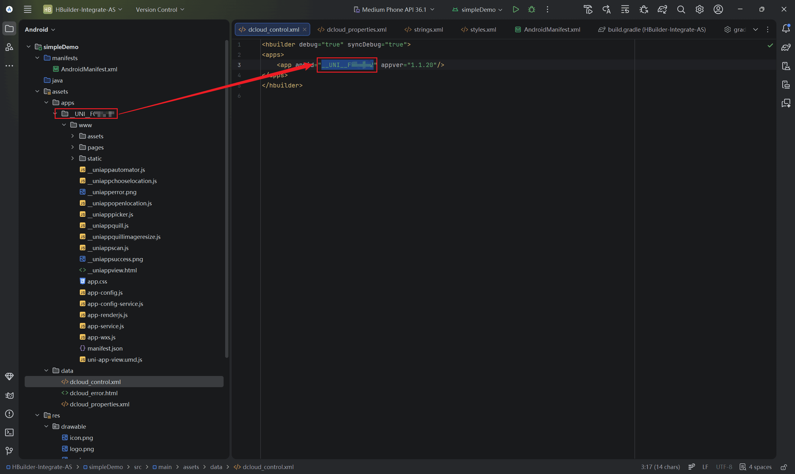 删除simpleDemo中assets/apps/下所有资源,从HBuilderX中生成本地App打包资源,将生成的的资源复制到该路径下。修改dcloud_control.xml中的appid确保dcloud_control.xml中的appid与manifest.json中的id与文件夹名一致,如下图所示:
